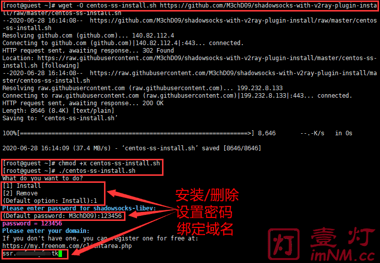 wget -O centos-ss-install.sh https://github.com/M3chD09/shadowsocks-with-v2ray-plugin-install/raw/master/centos-ss-install.sh chmod +x centos-ss-install.sh ./centos-ss-install.sh
