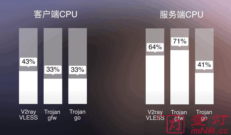 虽然 VLESS 已经是轻量版 V2Ray 的 VMess协议,但是在客户端表现对CPU占用仍旧比 Trojan-gfw 和 Trojan-Go 要高;在服务器端 Trojan-Go 优化更出色,对系统CPU资源占用低很多,表现非常好。