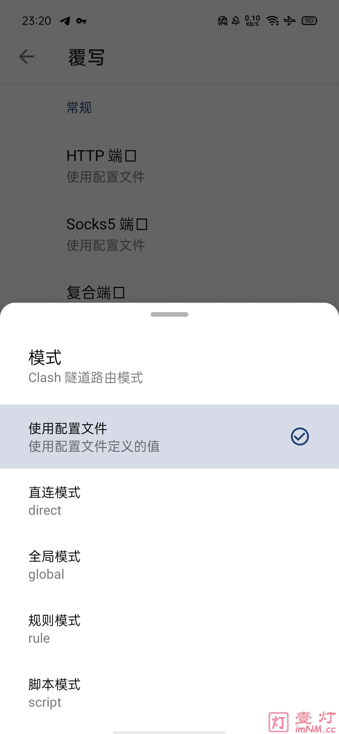 (2)如果是 Clash for Android 2.1.1 以后的版本,代理模式设置路径为设置 → 覆写 → 模式,如下图所示: